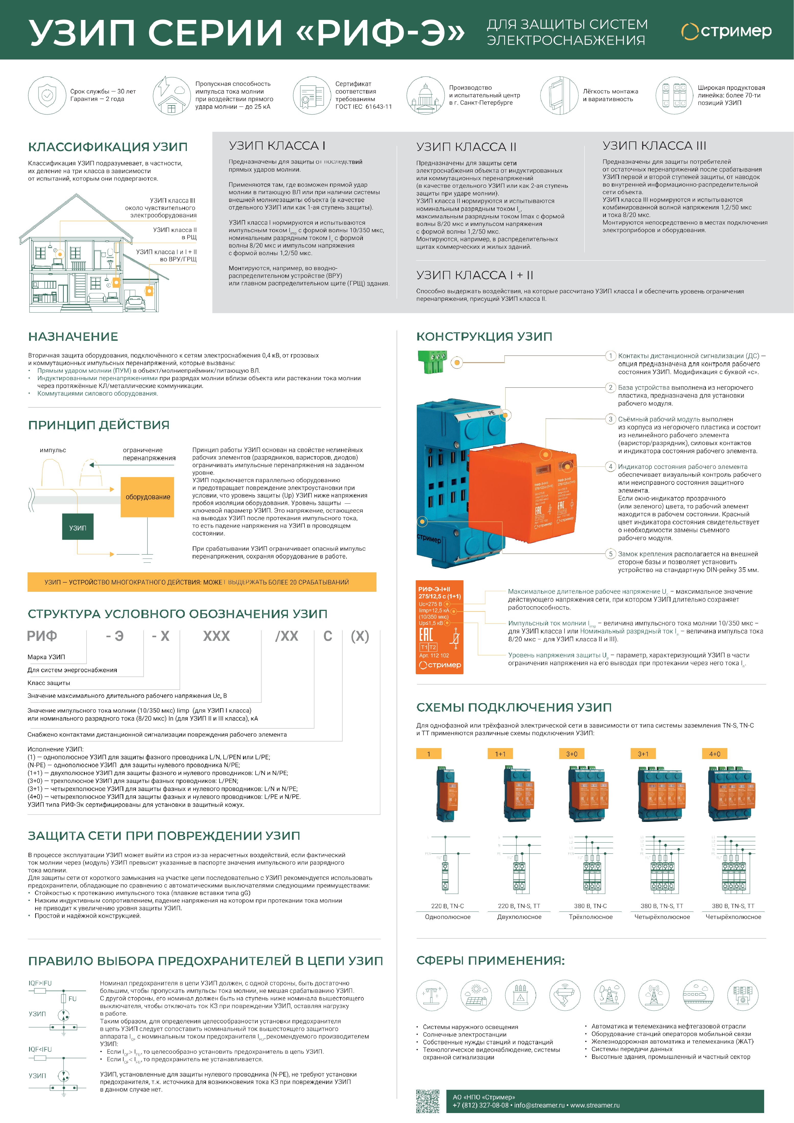 - РИФ-Э — УЗИП для систем электроснабжения классов I, I+II, II, III, II+III, а также II и I+II для постоянного тока.
